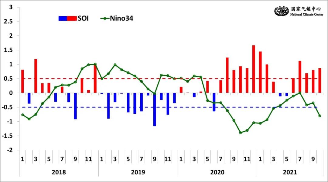 Ni?o3.4區(qū)海溫指數(shù)(℃)和南方濤動(dòng)指數(shù)(SOI)逐月演變