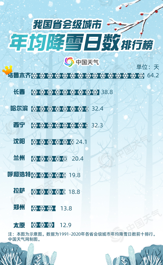 如果想賞雪,可以去東北、內(nèi)蒙古以及青藏高原、山東半島北部,這些地方遇雪概率高。從省會(huì)級(jí)大城市的降雪日數(shù)來(lái)看,烏魯木齊以年均雪日64.2天遙遙領(lǐng)先,長(zhǎng)春、哈爾濱、西寧也都超過(guò)30天;北京、石家莊、太原等城市大多在11至13天左右;杭州、合肥、武漢、南昌、上海為5至9天之間;福州、廣州、南寧等地年均雪日不足1天。