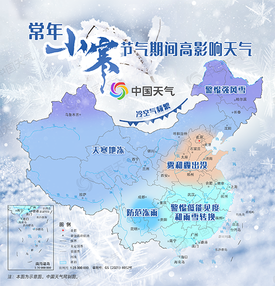 常年小寒節(jié)氣期間,南方氣溫也是明顯下降,秦嶺、淮河一線平均氣溫在0℃左右,江南、華南北部地區(qū)處于一年中較為干冷的時期,但仍需警惕低能見度和雨雪天氣的轉(zhuǎn)換,西南地區(qū)還要防范凍雨天氣的危害。