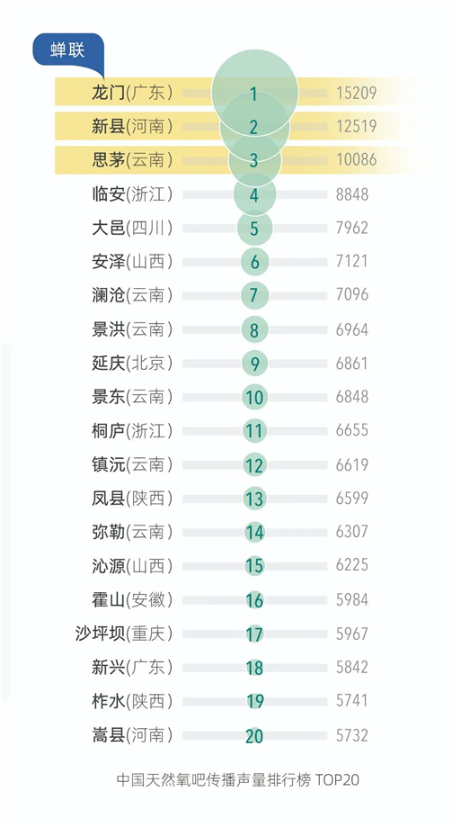在傳播聲量榜TOP20中,傳播聲量全部超過了5000,超過10000的共計(jì)3家,分別為廣東龍門、河南新縣、云南思茅,分列傳播聲量榜前三甲。其中,廣東龍門蟬聯(lián)榜首。